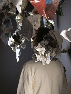 Le sol du couloir est recouvert d’une masse de papier qui crée des sons lorsque le visiteur déambule à travers l’installation, produisant une atmosphère étouffante et oppressante, dans laquelle il est submergé.